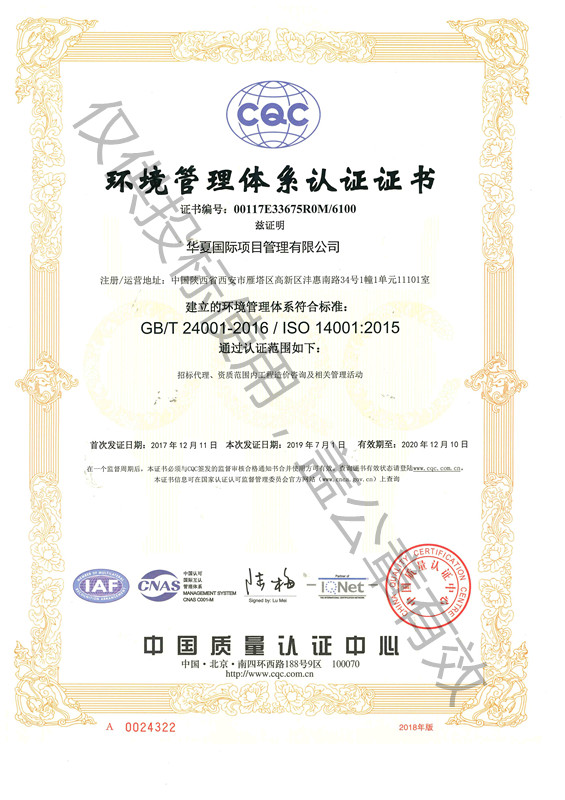 環(huán)境管理體系認(rèn)證證書